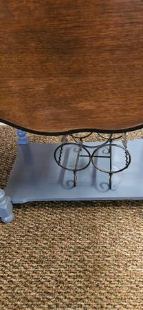 Victrola Mini Bar Lid opens to your glass ware and liquor. Includes wine rack on bottom shelf. Quite a conversation piece. Inside lid has all kinds of vintage sheet music. Glasses included 26 "wide...