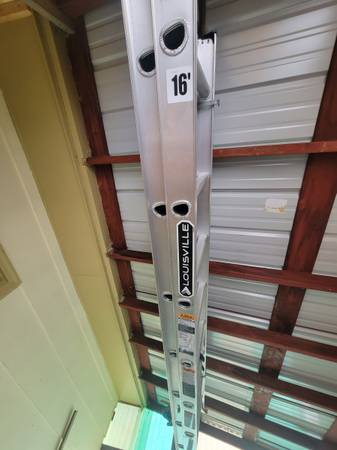Louisville 16' aluminum extension ladder in good used condition. Material: Aluminum (very lightweight and easy to carry). Size: Extends to 16 feet. Perfect for gutter cleaning, painting, and general...